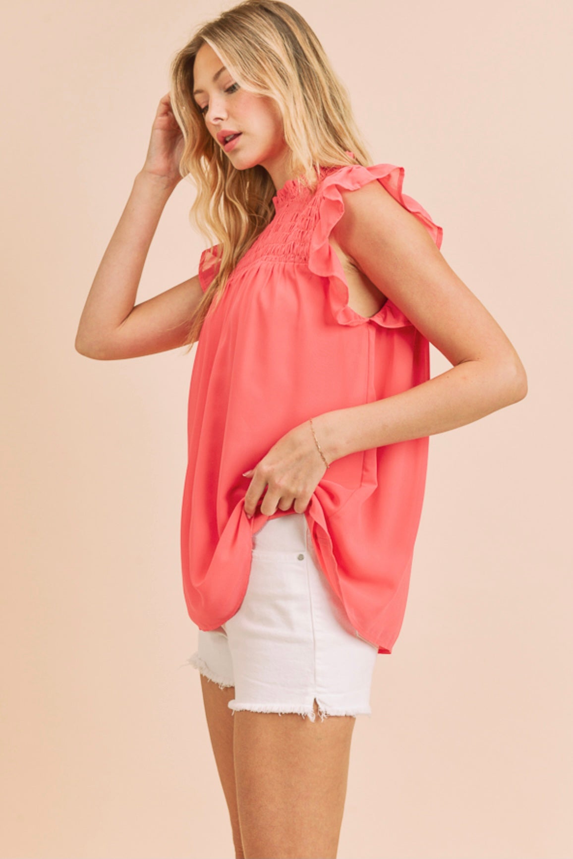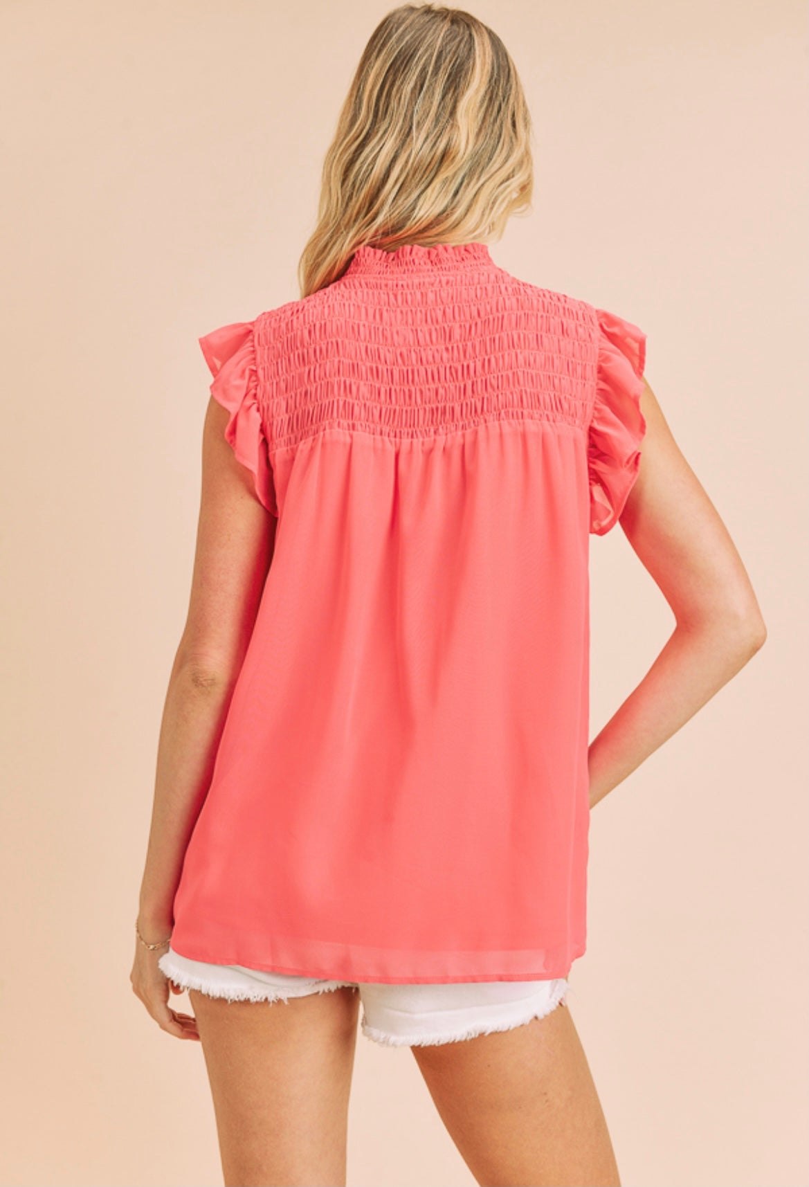 This gorgeous top is the perfect addition to your spring wardrobe! This chiffon sleeveless blouse has frill and smoking detail that you will absolutely adore! Comes in two super fun colours