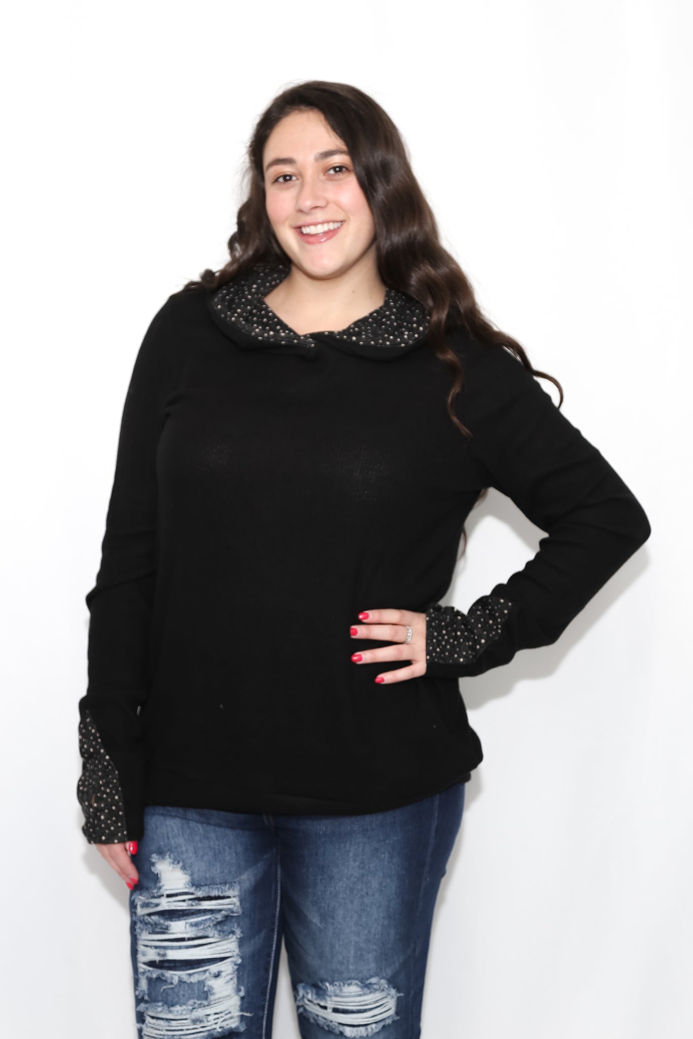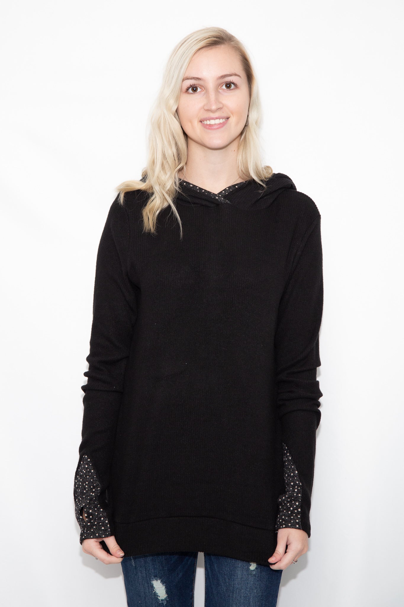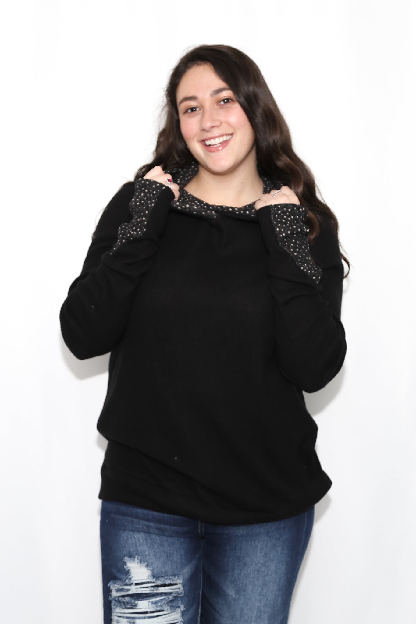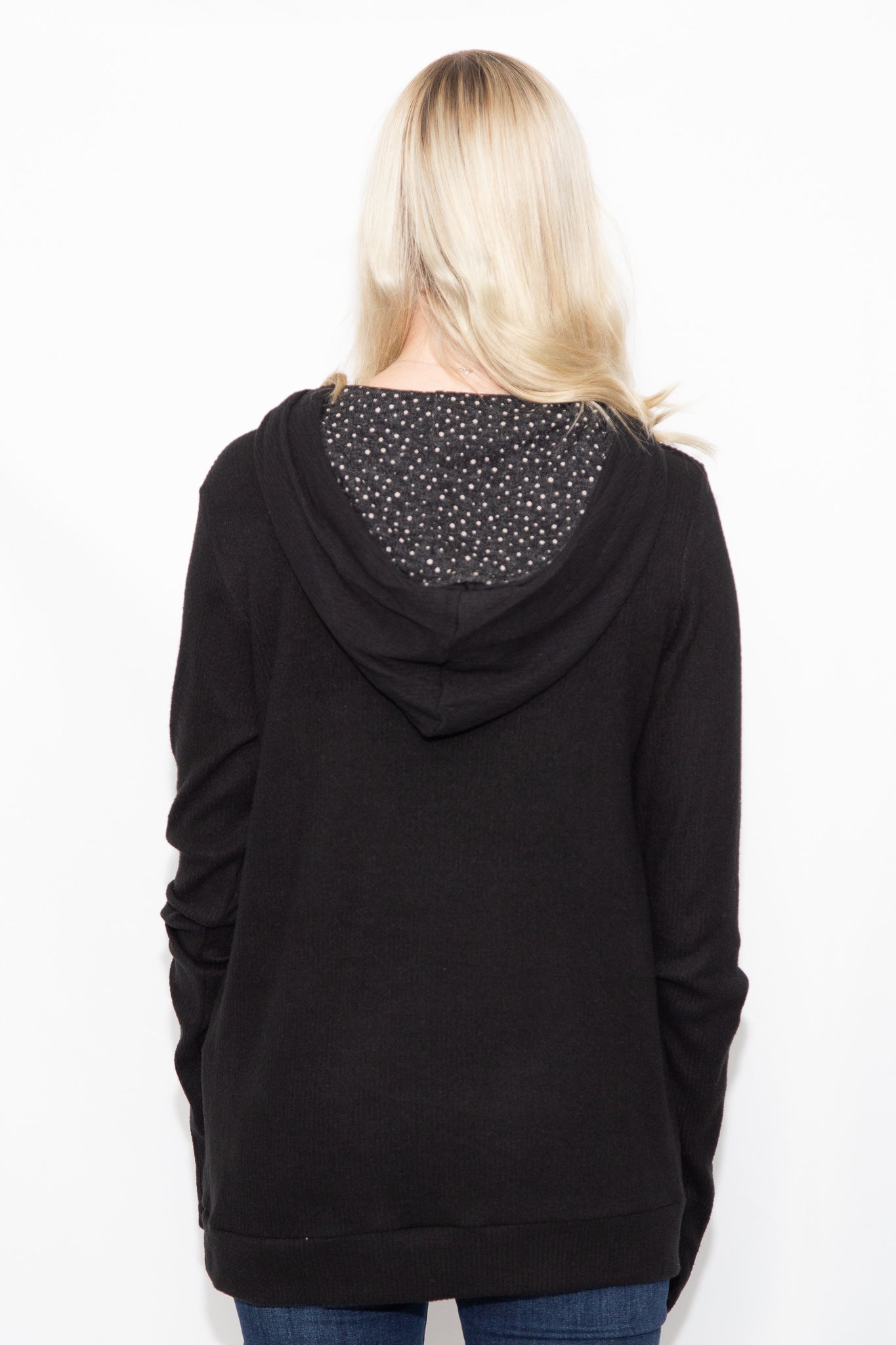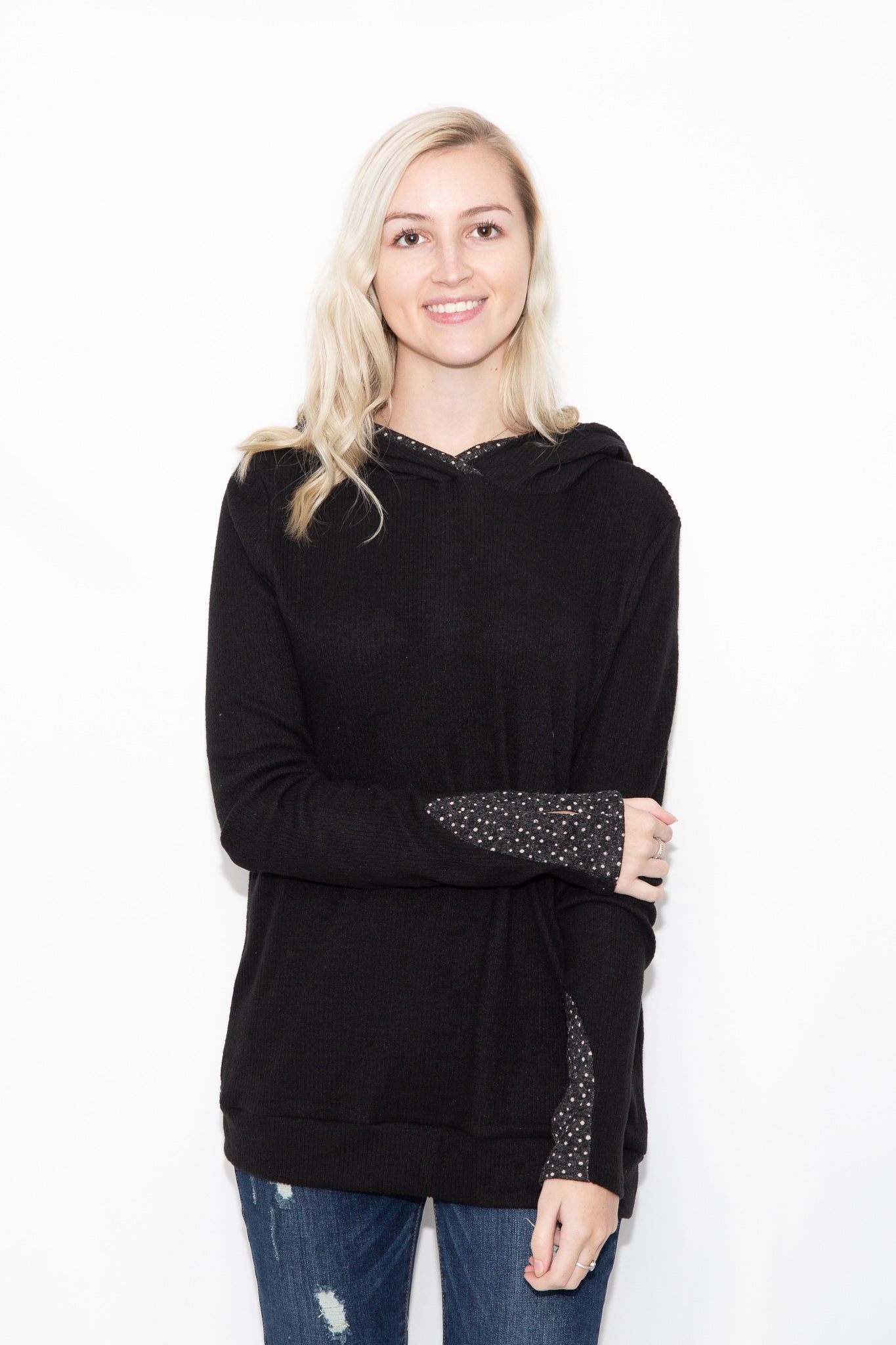 This comfy hoodie features a soft ribbed black body with polka dot detail on the thumbhole and inside of the hood.